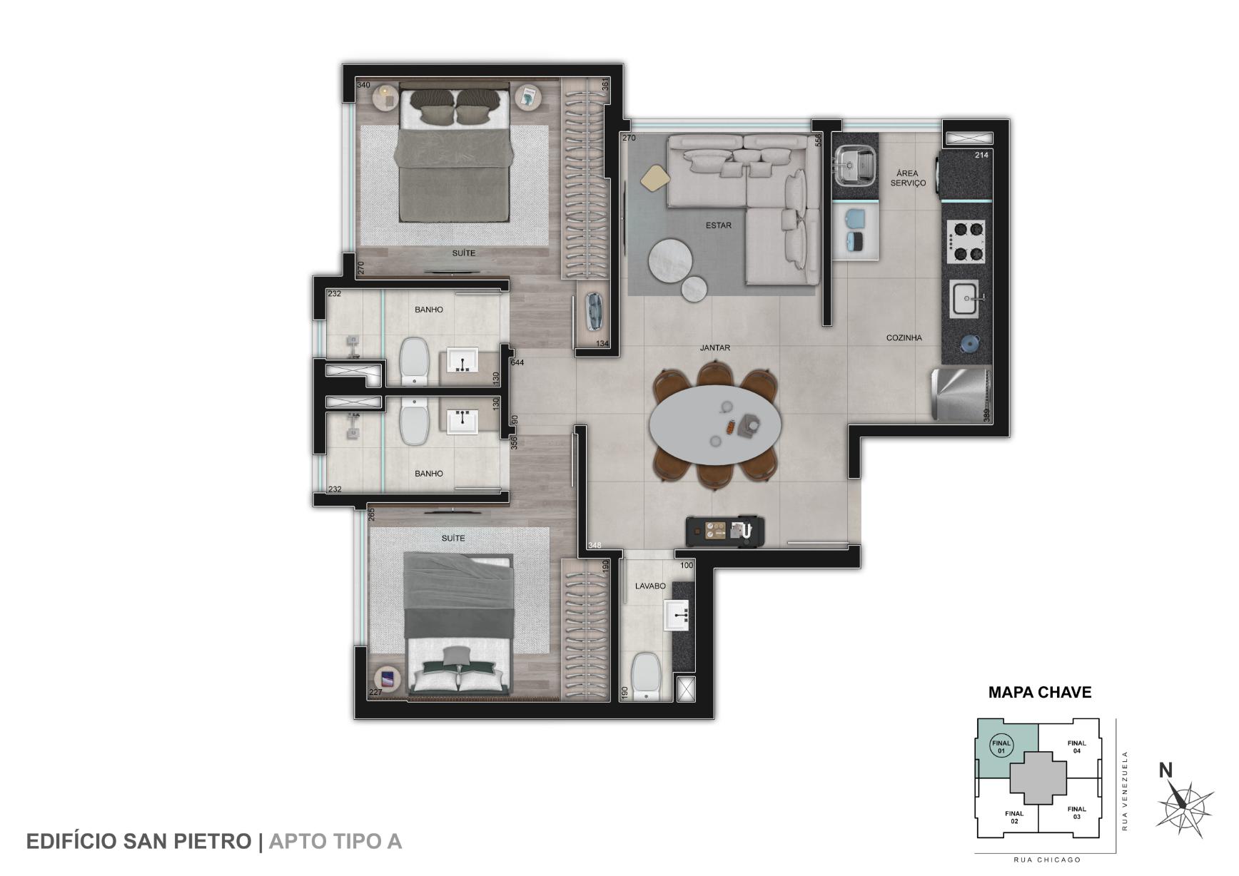 Em cada detalhe do seu novo apartamento, você conhecerá novos padrões de exclusividade. Escolha a planta que reflete seu estilo e sinta-se em casa desde o primeiro momento.